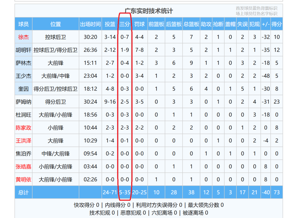 广东队之所以会糟糕惨败,有两个方面的因素,一个就是球队三分球命中率太糟糕,全场比赛,广东队三分球出手35次,只命中了5球,三分球命中率只有14%,十分惨烈(胡明轩三分球9中1,徐杰7中0,萨林杰4中0)。反观,上海队三分球出手35次,但是,他们却命中了19球,命中率达到了惊人的54%,在三分球方面,上海队赢了52分。