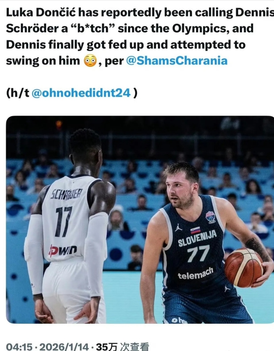 施罗德和东契奇俩人都是欧洲球员,在欧锦赛和世界杯上也是经常交手,尽管施罗德在NBA表现的很一般,但到了国际赛场可谓是大杀器,甚至还率队拿到过世界杯冠军和决赛MVP。shams称东契奇一直喋喋不休,甚至在比赛里还揭露施罗德的伤疤,拿施罗德没有签8400万大合同来说事,结果施罗德是忍无可忍才动手打了东契奇。