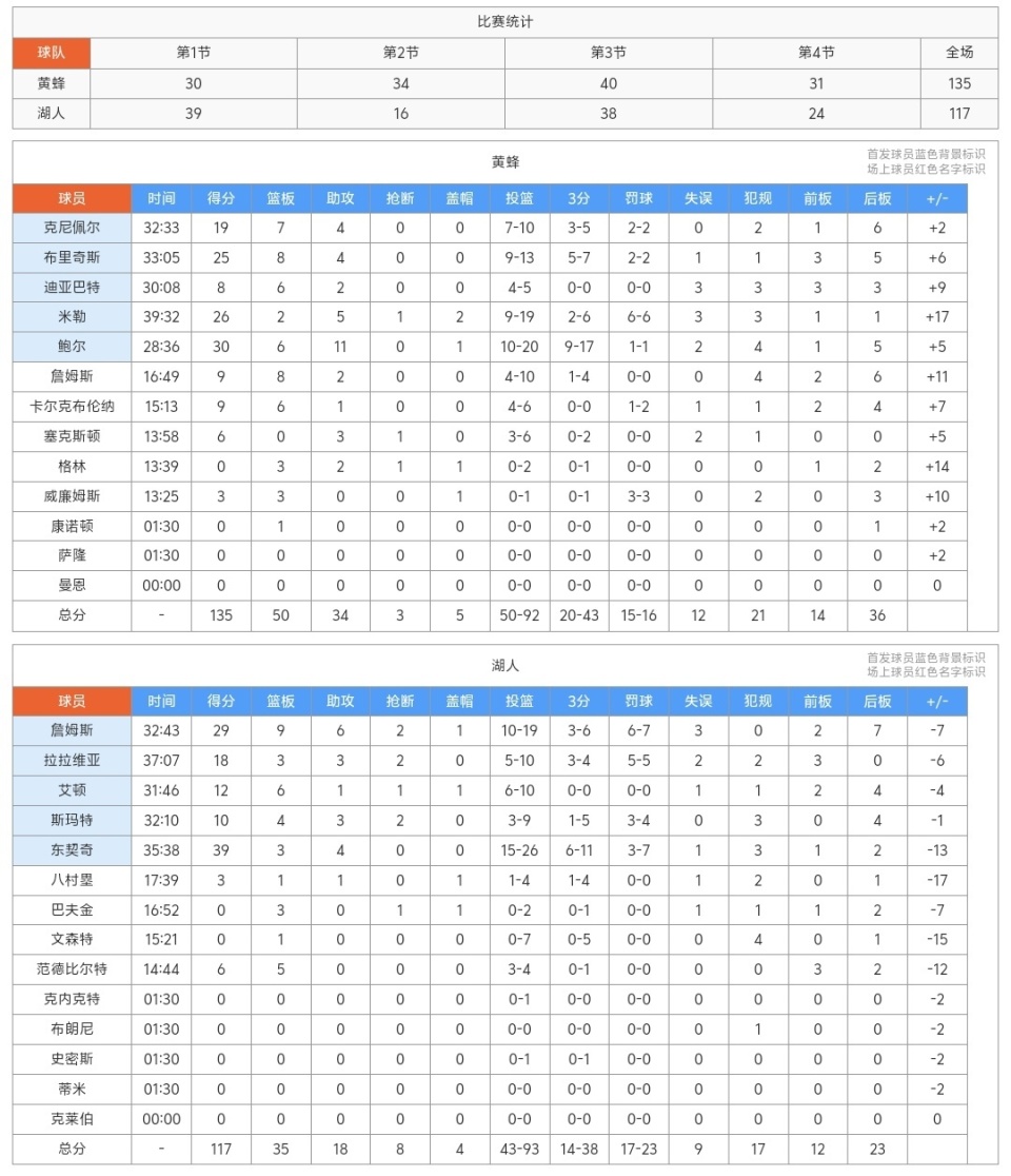 湖人117-135爆冷负黄蜂,詹姆斯29+9+6,谁是输球罪魁?数据不会说谎!
