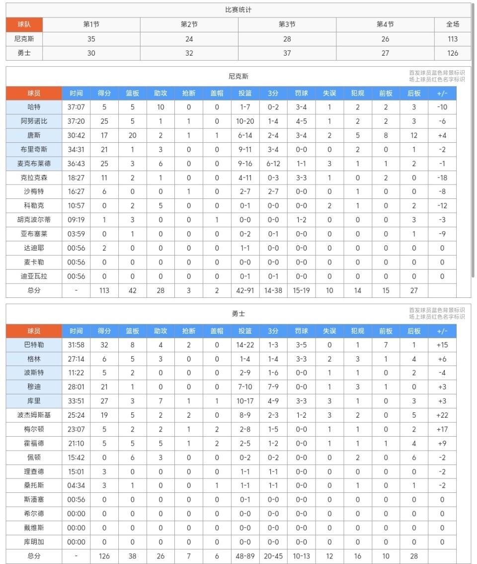 勇士126-113击败尼克斯,库里27+7,谁是赢球最大功臣?数据一目了然!