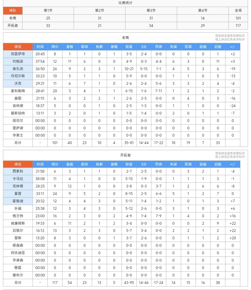 第二节老鹰队开始发力,奥孔武、麦科勒姆、约翰逊和沃克等人都持续发挥,他们逐渐缩小了差距,开拓者夏普和格兰特进攻打得还可以,防守实在是不行,中场休息时,开拓者54-56被反超了!下半场第三节易边再战,两队打出了五五开的局面,老鹰队奥孔武和麦科勒姆联手维持局面,末节开拓者多人爆发,他们单节轰出29-14的比分,彻底拉开了差距,最终开拓者击败了老鹰!
