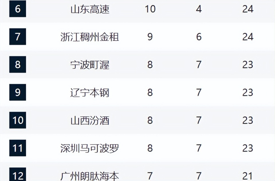 4-6分别是青岛、北京和山东。本赛季青岛一直都可以名列第一梯队,至于北京最近的情况越来越糟糕,这轮再度输在了关键球。山东目前已经八连胜,他们和上海一样,都是开局低迷,但全部都通过调整完成崛起。