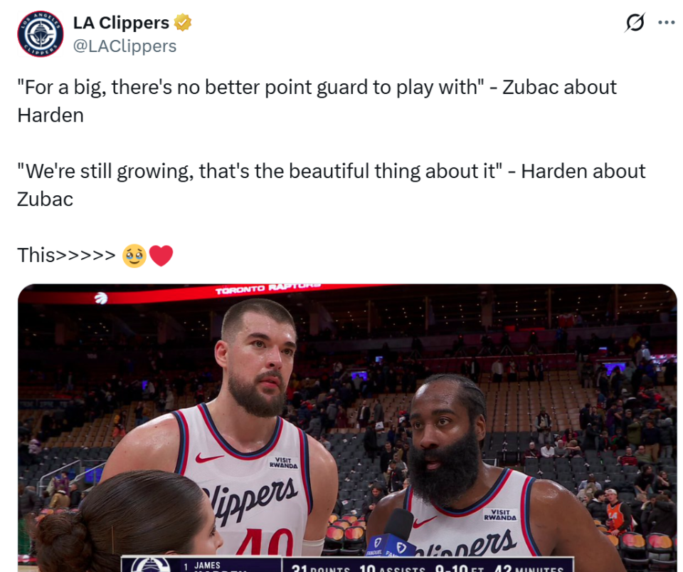 更重要的是,哈登本场成功激活祖巴茨,后者在持续低迷的情况下,本场10投7中,拿到16分14板(3个前场板)2助的两双数据,正负值+15快船首发第一。