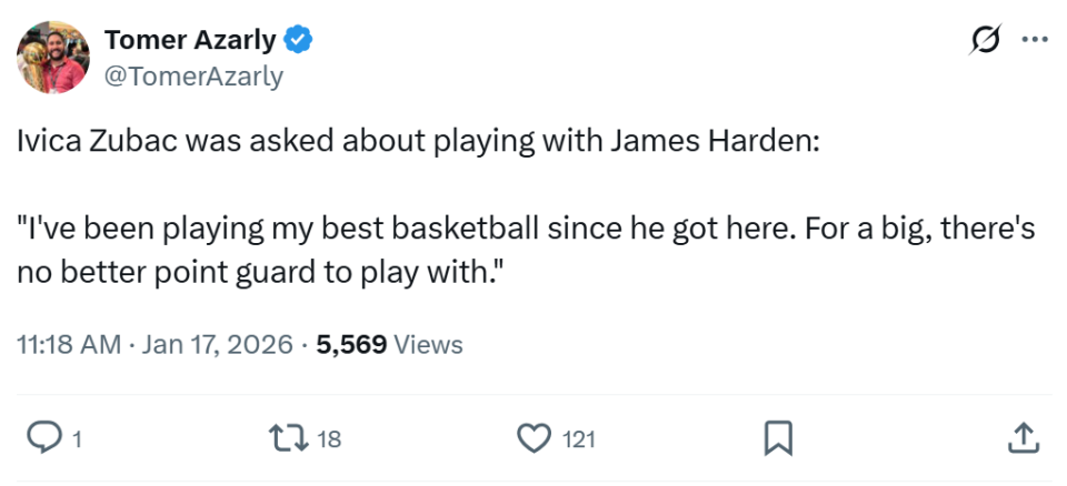 赛后祖巴茨也点名感谢哈登:“自从哈登加盟以来,他帮助我打出最好的篮球,对于大个球员来说,没有比他更好的控卫了。”