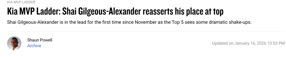 好在过去半个月雷霆队强势完成自我证明,亚历山大也用连续112场拿下20+得分表现再度登顶MVP榜首,唯一有可能让其无法实现MVP两连冠的原因只有审美疲劳。