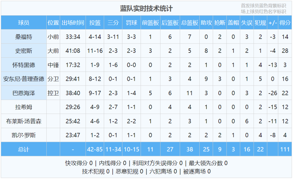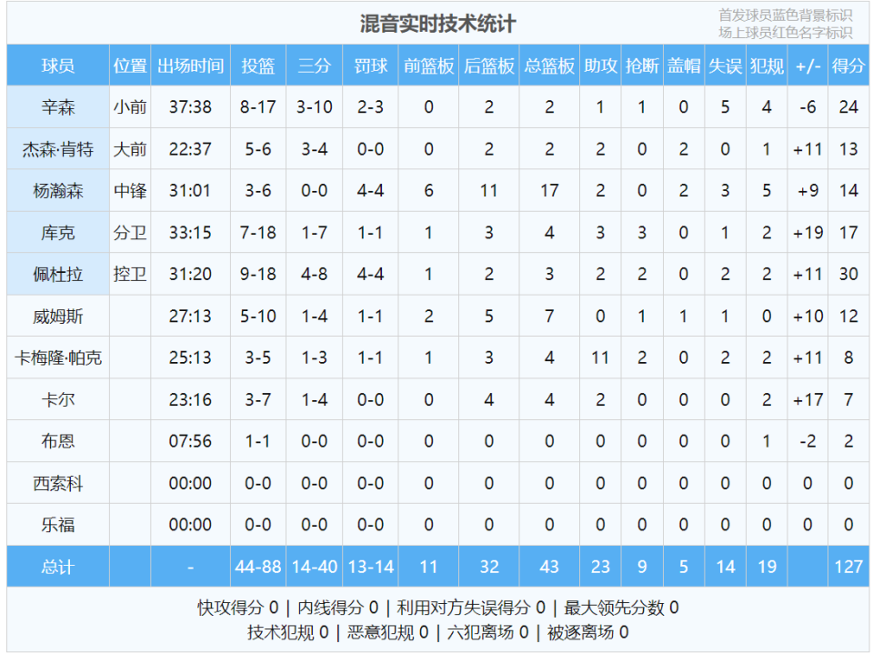 第四节蓝队被打急眼了,凯尔-罗斯直接将杨瀚森放倒在地。小杨比较淡定,没跟对手发生冲突。杨瀚森第四节没有出手机会,只抢了两个篮板球。比赛还剩3分多钟,杨瀚森打卡下班。全场结束,混音127-111击败蓝队,双杀对手。