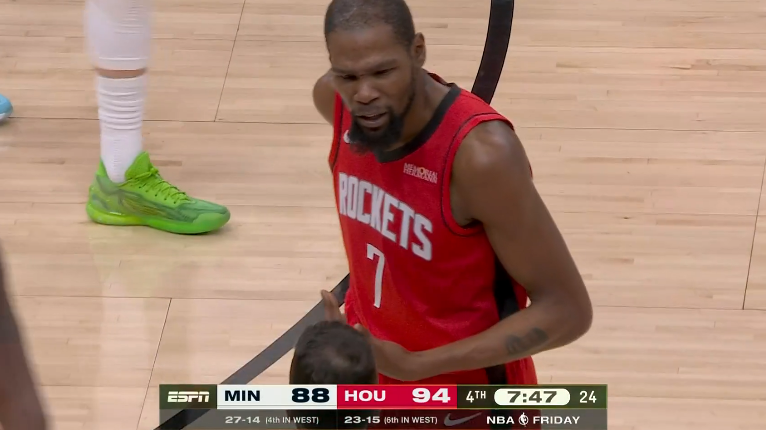易边再战,第三节火箭和森林狼打得十分胶着,火箭28-27又追回1分,期间丰田中心球馆的计时器出现问题,杜兰特和爱德华兹开心闲聊,这一节杜兰特贡献7分。