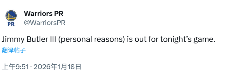 在这场比赛正式开打前,巴特勒拿着咖啡走进球馆,勇士官方晒出了本场首发阵容,巴特勒也在其中。但比赛开打后,理查德顶替巴特勒首发,巴特勒也没有出现在场边。直到比赛打了快半节,勇士官方才发布公告:巴特勒因个人原因将缺席今天的比赛。