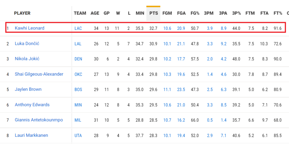 在快船打出12胜2负期间,小卡打了13场比赛,战绩11胜2负。小卡在这段时间里场均得到32.7分6.9篮板3.8助攻2.6抢断1.0盖帽,这完全是攻防一体的表现。值得一提的是,小卡的场均得分力压这段时间场均得到30.9分的东契奇排名第一。