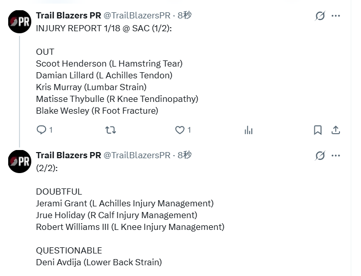 大概率缺阵的包括:格兰特(左跟腱伤病管理)、霍勒迪(右小腿伤病管理)、罗伯特-威廉姆斯(右膝伤病管理)