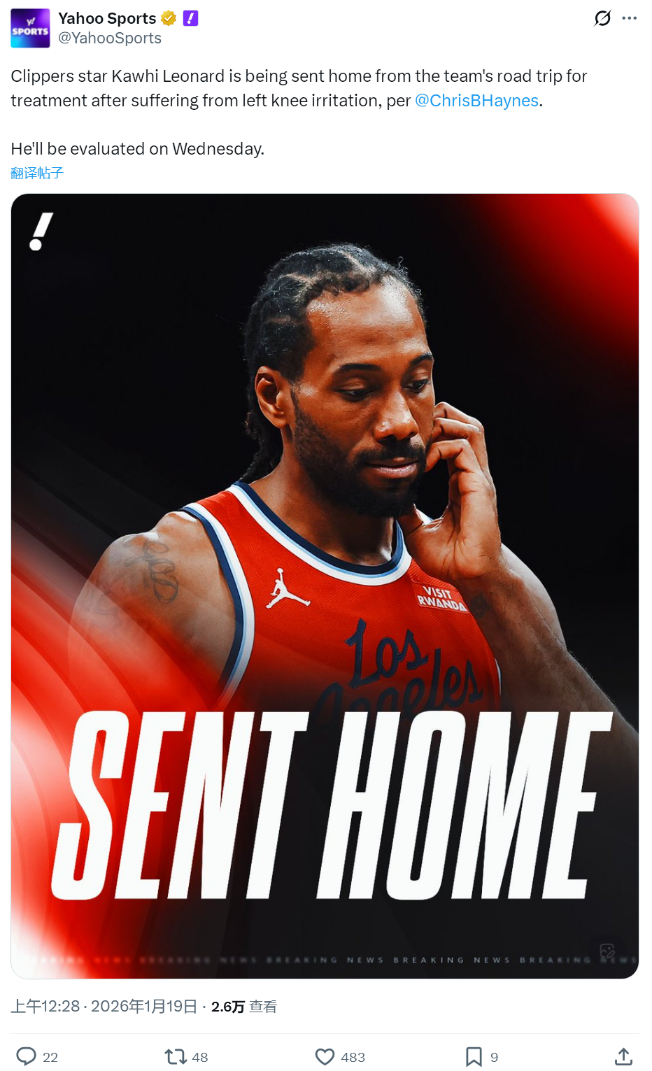 北京时间1月19日凌晨,据NBA名记Chris Haynes报道,伦纳德左膝受伤,提前离队、飞回洛杉矶接受治疗,将在三天后接受进一步评估。快船正在经历三连客,上一场和猛龙的比赛伦纳德没打,接下来对阵奇才和公牛他也将缺席。