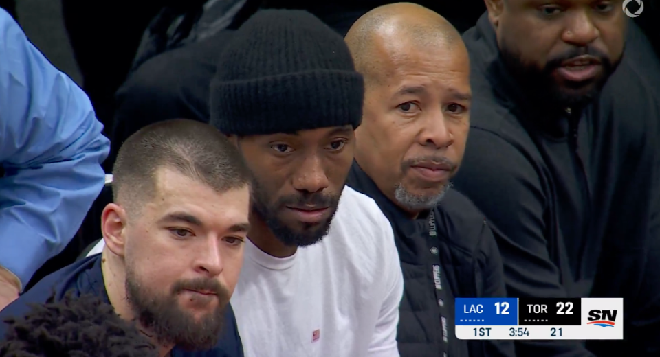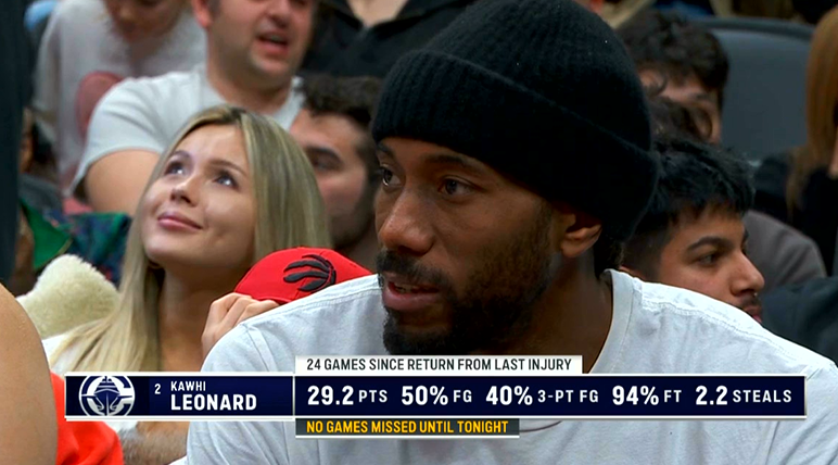 上一场客场打猛龙,伦纳德就因为伤病,缺席了,不过还是有随队到多伦多的。
