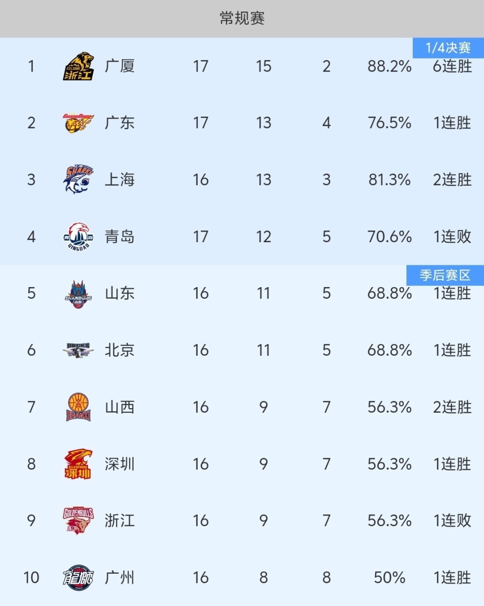 随着广东104-76大胜,广厦胜青岛,CBA最新积分榜出炉:广东超上海,排名第2!