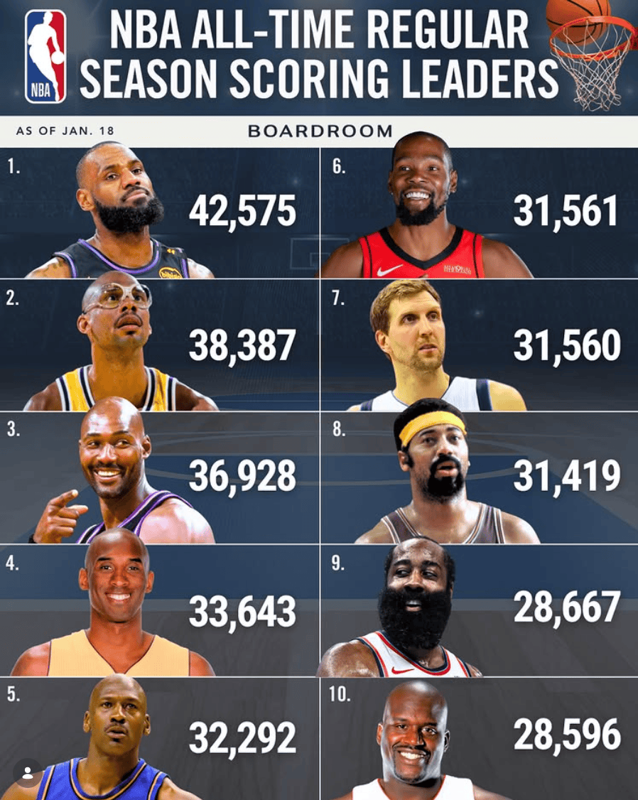 火箭官方晒历史得分榜:祝贺杜兰特升至历史得分榜第六位!