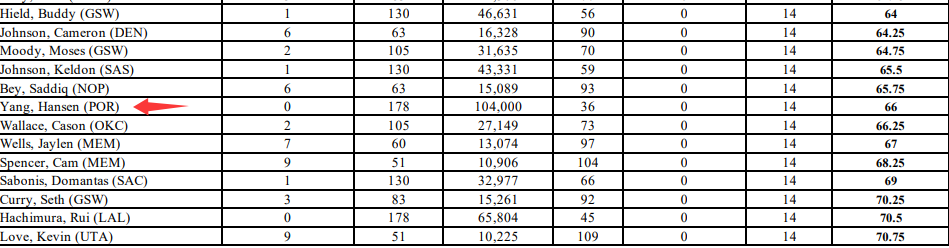 杨瀚森的加权得分是66(分越低排名越高,东契奇是1.75),在他后一位是雷霆的卡森-华莱士,在他前一位是鹈鹕的萨迪克-贝。