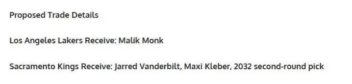 据美媒《FW》透露湖人、国王正在酝酿一笔3换1交易。具体为湖人送出范德比尔特、克勒贝尔、32年次轮得到马利克·蒙克。