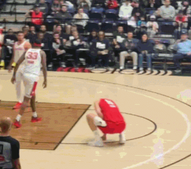 杨瀚森掩护被对手撞到腹部痛苦弯腰蹲在地板上。