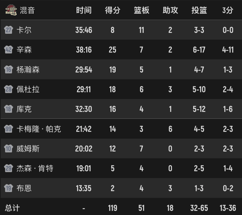 末节杨瀚森在场上带动全队,混音队打了一波15-7。比赛还有不到4分钟时,混音108-99领先。混音队的整体实力在对手之上,在决胜时刻,混音队球员打得更加流畅,逐渐锁定了胜局。全场比赛结束,混音以119-109获胜,已经连赢5场。