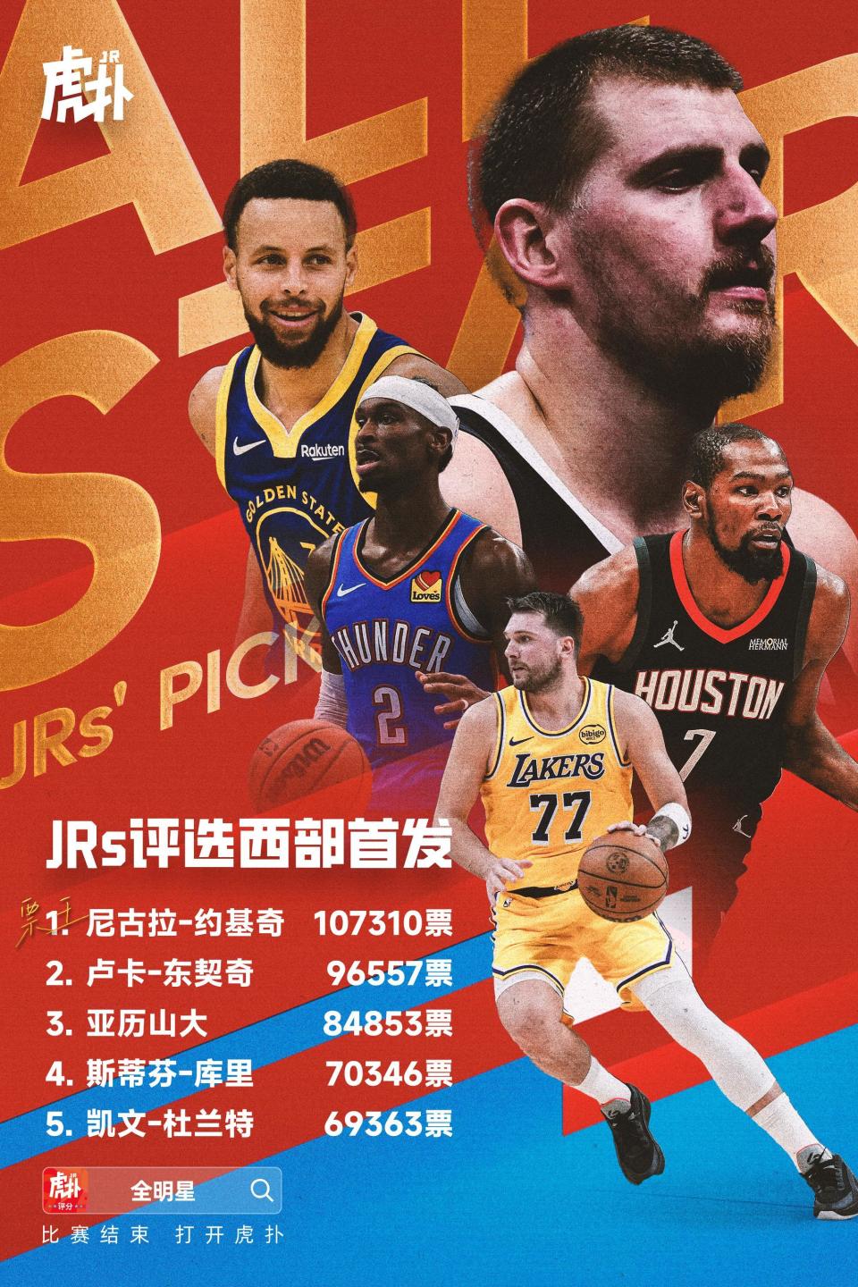 JRs西部全明星首发评选结果:约基奇票王,东契奇、SGA、库里、杜兰特首发