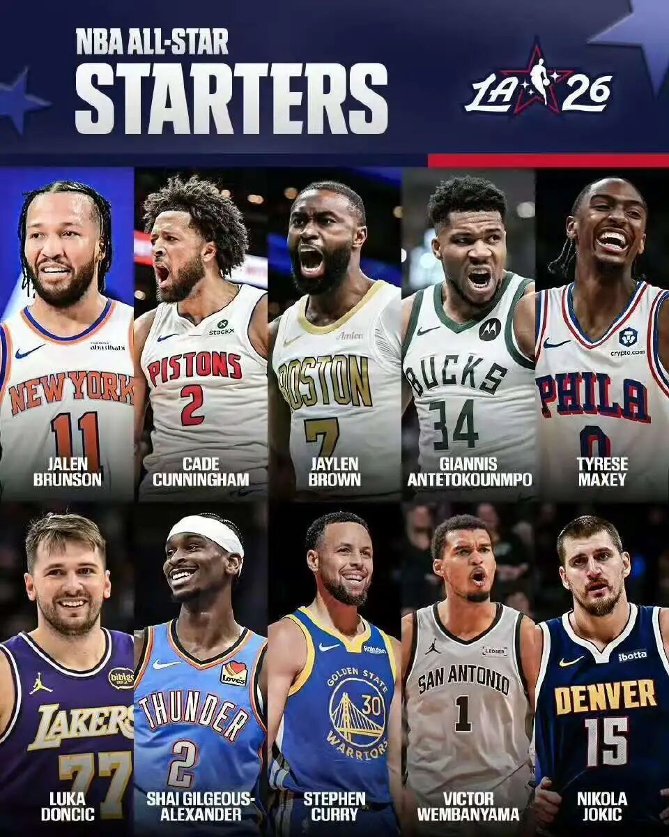 千呼万唤始出来,NBA全明星首发阵容如下: