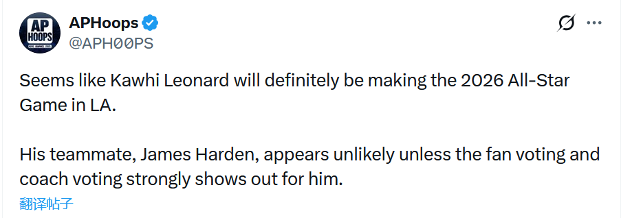 北京时间1月21日,NBA常规赛继续进行。NBA官方昨天公布了今年全明星首发阵容,其中快船队无人入选。在谈到哈登情况的时候,快船媒体APHoops直言莱昂纳德的机会更大一些。