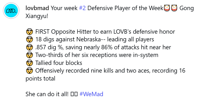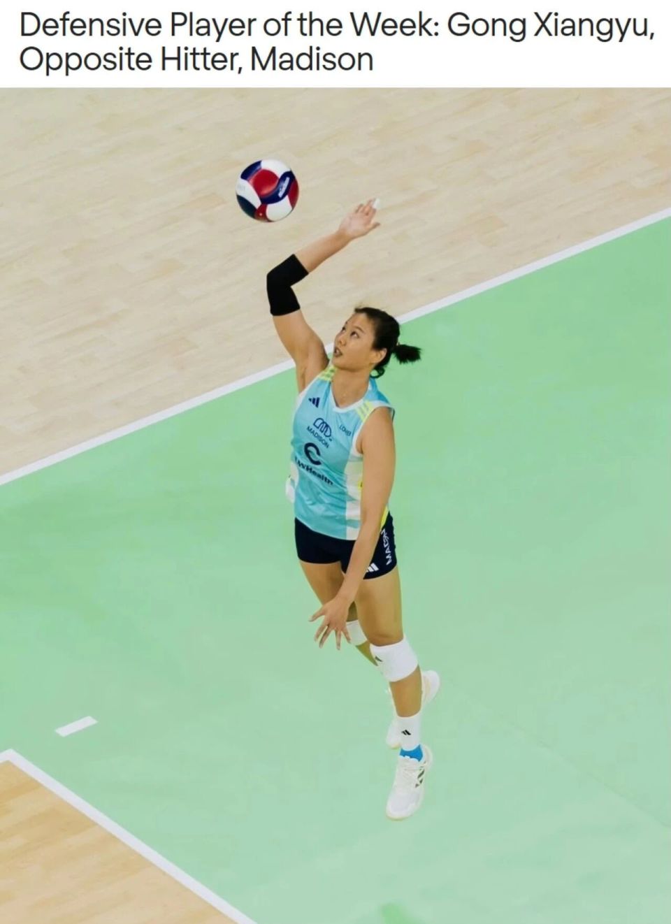 麦迪逊女排官方也在社交平台发文,细数她的高光数据并送上祝贺:“恭喜我们的第二周最佳防守球员——龚翔宇!作为联盟首位获此殊荣的接应,她在对阵内布拉斯加的比赛中拿下18次防守(全场第一)、85.7%的防守成功率、6次一传中三分之二完美到位、4次拦网,进攻端贡献9分+2记ACE,总计16分,她用实力证明自己能胜任所有环节!”