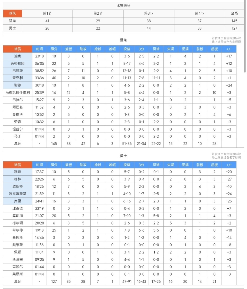 勇士127-145惨负猛龙,库里单核带不动,谁是输球罪魁?看数据!