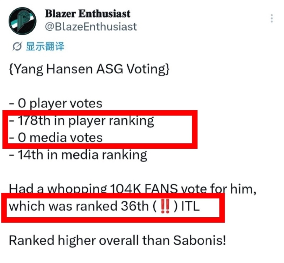 2026年NBA全明星投票的尘埃刚刚落定,随之而来的却是一场关于“流量与实力”的激烈辩论。在刚刚公布的票选结果中,来自波特兰开拓者的中国新秀杨瀚森虽然在球迷投票环节斩获了104,000张选票,高居NBA全联盟第36位,但在代表专业视角的媒体和球员投票栏中,他毫无疑问挂零。让“吉祥物”的嘲讽声甚嚣尘上,甚至有声音认为这仅仅是庞大中国市场带来的一次数据虚火。然而,就在舆论一边倒地看衰杨瀚森的全明星前景时,开拓者随队记者凯西·霍尔达尔(Casey Holdahl)在官方播客中的一席话,却为这一事件打开了另一扇窗。(数据来源@Blazer Enthusiast)
