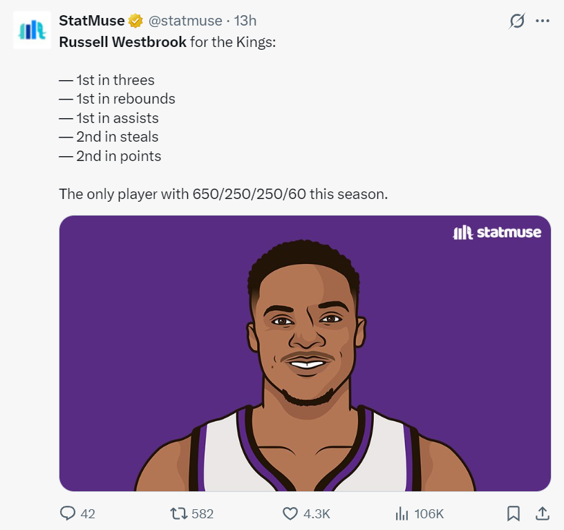 此役转播方还在比赛间隙晒出威少本赛季在国王的数据,得分678分第二、三分89个第一,篮板272个第一,助攻306次第一,抢断61个第二,就连官方都为37岁的威少点赞了。