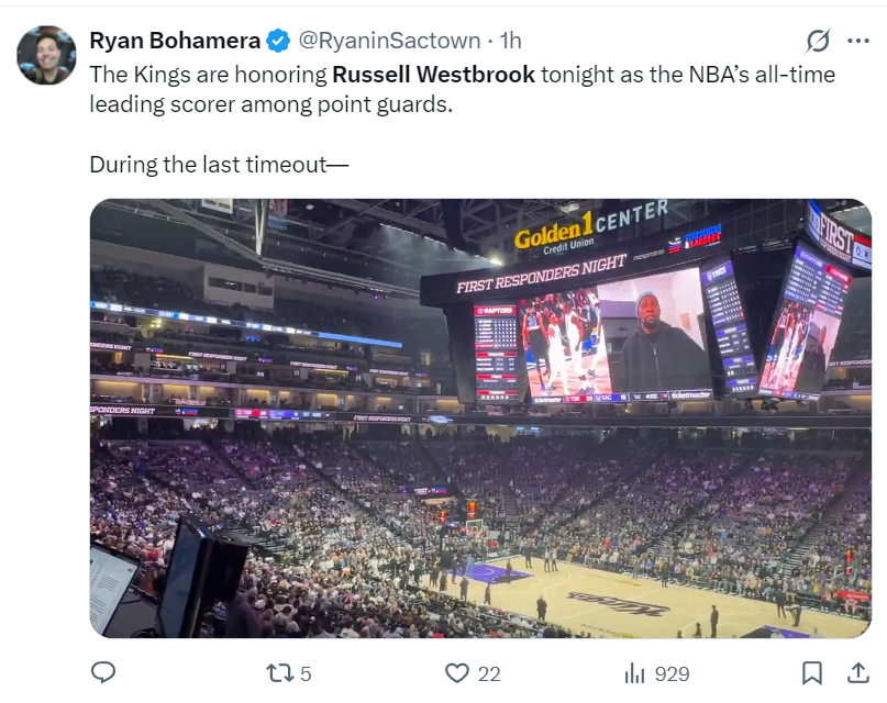 这场比赛开始之前,国王官方就晒出了一段视频,大O出面祝贺威少成为NBA历史得分最高的控球后卫。