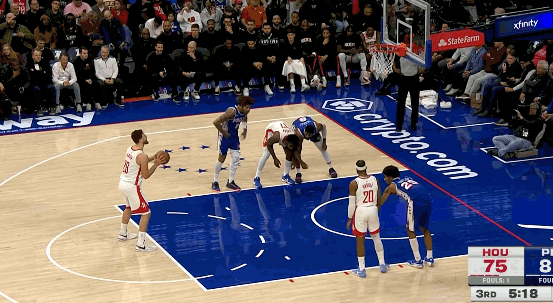 末节,恩比德中投得分,沃特福德上篮得手,杜兰特勾手得分,谢泼德三分命中还造成格雷姆斯犯规,但加罚不中。卡佩拉空接扣篮,小史密斯扣篮,杜兰特中投命中,谢泼德三分命中,火箭轰出一波17-2,反超76人9分。恩比德三分命中,小史密斯再次扣篮。伊森三分命中,马克西连得7分。伊森三分再中,乔治、马克西接连得分,追平火箭。杜兰特中投得分,乔治抢断杜兰特,马克西再次扳平。杜兰特中投不中,76人还有13.2秒进攻时间。虽然杜兰特封盖马克西,但慢镜头显示马克西上篮先碰板,受限于规则无法挑战,这一明显干扰球没法改判。裁判给了争球,比赛进入加时。