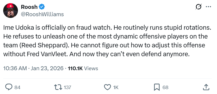 因此火箭播客主持人Roosh Williams在乌度卡给出理由后依旧怒喷到:“乌度卡已经被正式列入欺诈名单,他经常摆出愚蠢的轮转阵容,拒绝让队中最有进攻活力之一的谢泼德登场,没有范乔丹,他根本不知道如何调度进攻,甚至现在连防守也没有了。”