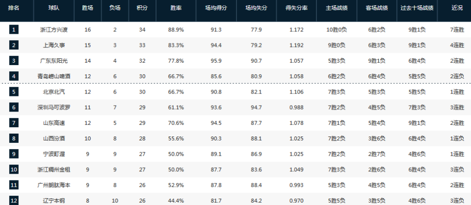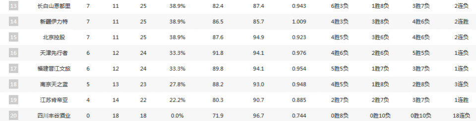 对于积分榜的影响相对比较大,上海4连胜冲上了积分榜第二,山东近11战10胜上升到第七,辽宁则是跌至第十二,南京一波9战8败跌至第十八。