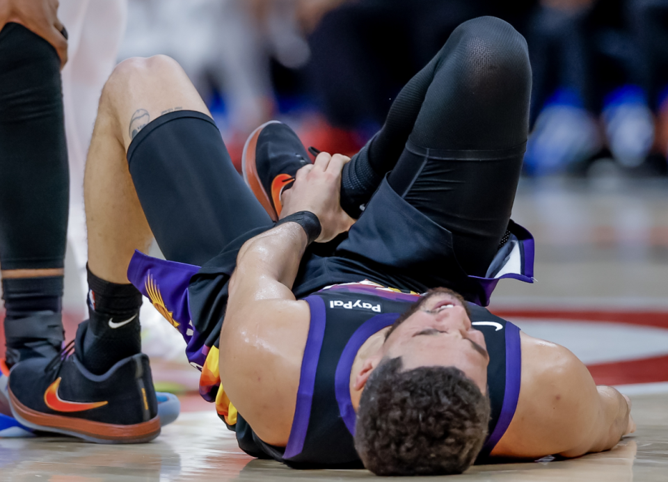 更无奈的则是布克,同样是和老鹰的比赛,杰伦格林先退出比赛后,布克在跑动时,没有注意到奥孔武,奥孔武也没看到布克,布克误踩对方的脚:严重脚踝扭伤!用主帅奥特的话说,布克的伤势不太乐观,球队需要做好他缺阵的准备,其他人需要站出来。但事情可能没那么简单,看一组数据,本赛季布克在场时,太阳净效率值是+5.1,联盟第五水平,大致相当于马刺;布克不在场时,太阳净效率值-0.5,大致相当于湖人水平,联盟第17位。一定有球迷疑问:湖人战绩不是和太阳差不多么?太阳没布克能差到哪去?