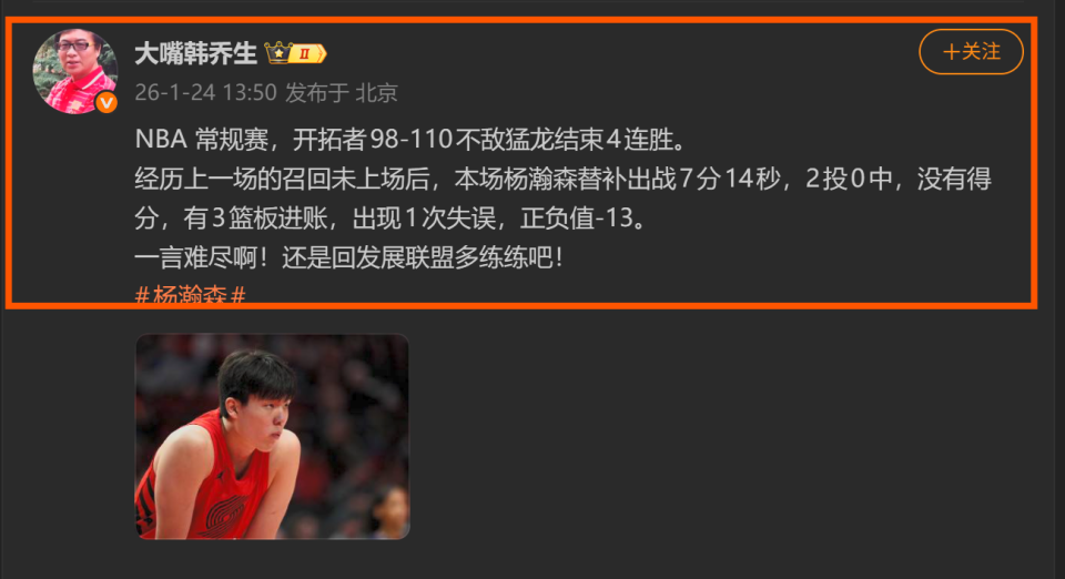 开拓者队在主场以98-110不敌多伦多猛龙,对于主教练斯普利特而言,这场失利或许只是漫长赛季中的一次常规调整,但对于在大洋彼岸时刻关注着的中国球迷来说,这场比赛的数据单却显得格外刺眼。在经历了上一场的DNP后,中国中锋杨瀚森终于获得了宝贵的出场机会。然而,在替补出战的7分14秒里,他交出的答卷是:2投0中,0分3篮板1失误,以及全场最低的-13正负值。这短短的七分钟,像是一盆冷水,无情地浇灭了外界对他“练级归来”的虚幻期待,也让残酷的现实摆在了台面之上。
