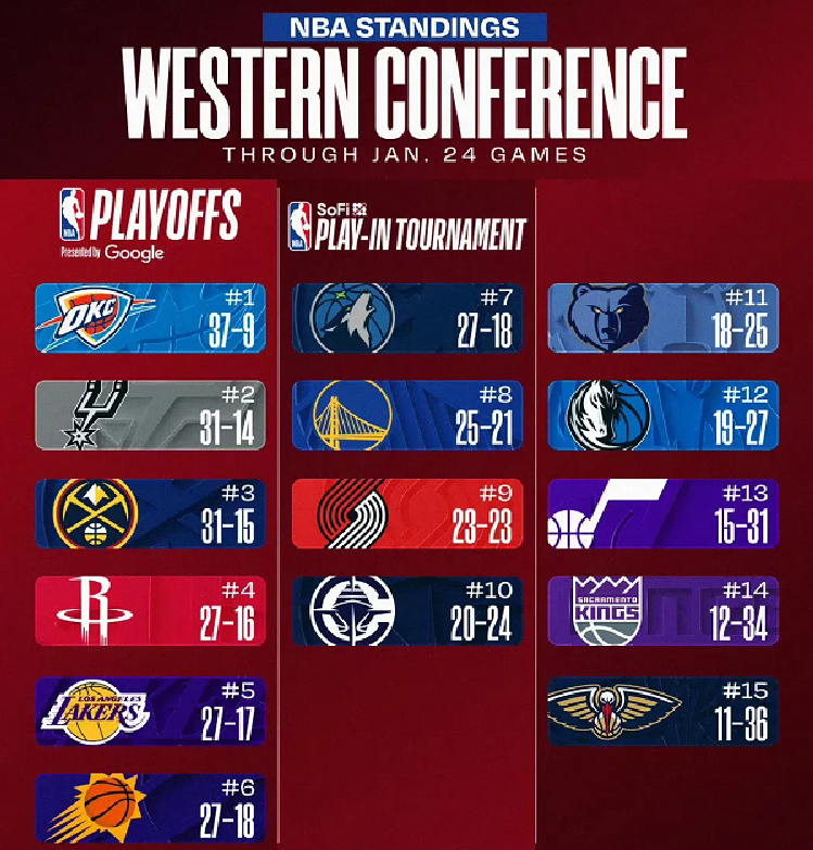 本赛季至今,火箭以27胜16负排名西部第四,仅领先第七的森林狼1个胜场,在此期间球队场均助攻数24.9次位列联盟第25名,场均回合数96.8联盟倒数第四。