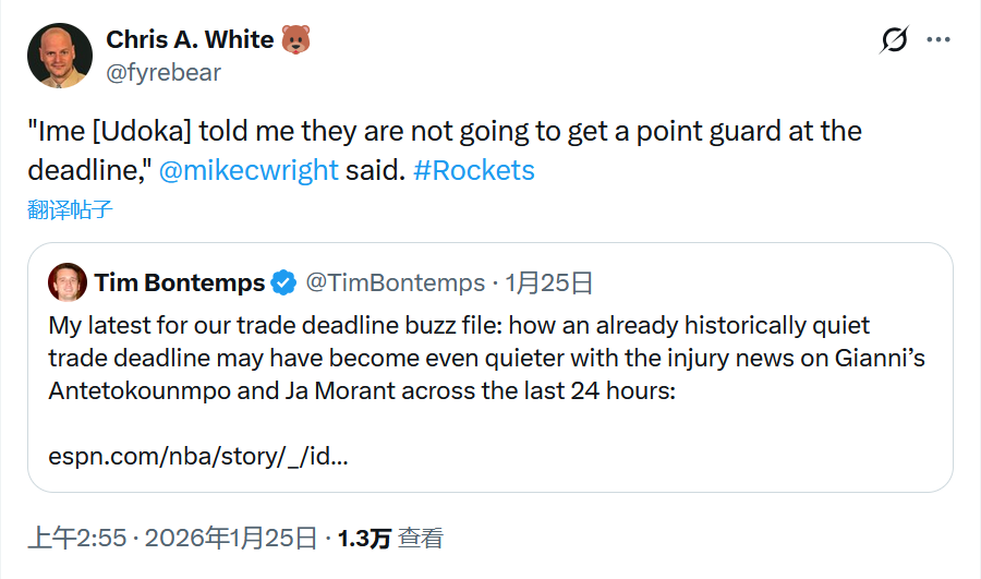 然而,据火箭记者fyrebear更新动态发文表示:火箭队主教练乌度卡告诉我,球队在交易截止日前不会引进控卫球员。