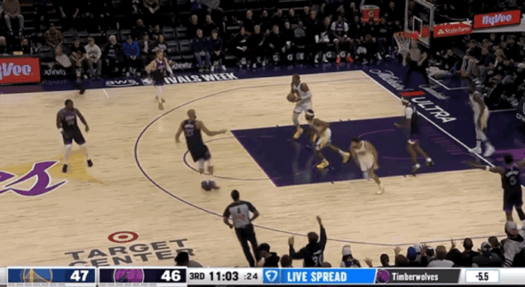 易边再战,波杰姆斯基快攻上篮,个人开局连得6分。麦克丹尼尔斯三分命中,库里和穆迪连得5分,兰德尔后仰跳投,波杰姆斯基跳投回应。追梦格林补篮得手,爱德华兹2罚全中,库里急停跳投,爱德华兹上篮得手。桑托斯空切得分,兰德尔暴扣得手,理查德三分命中。勇士打出一波19-4的进攻高潮,成功将分差拉开到24分,海兰德突破挑篮打进。三节比赛结束,勇士85-63领先森林狼。