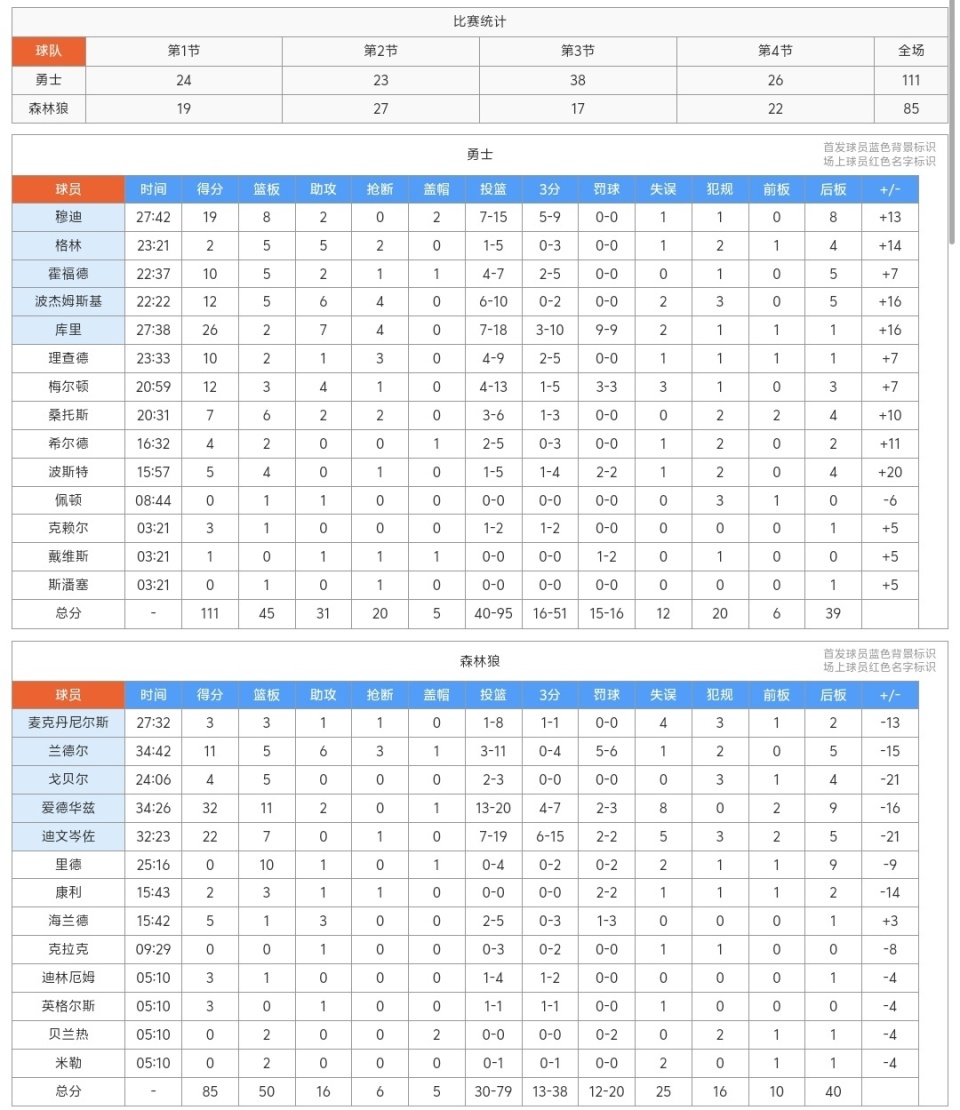 下半场第三节易边再战,勇士队迎来了集体大爆发,他们全队的进攻都很靠谱,单节轰出38-17的比分,直接把森林狼打懵了,森林狼的进攻和防守都不合格,勇士的领先优势直接来到20分以上,末节勇士继续多人发挥,森林狼没有能力改变结果,最终勇士获胜,森林狼继续连败!