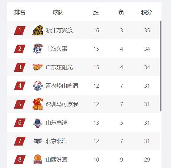 近期山东高速男篮非常强势,在被江苏队终结了8连胜之后又拿到了一波3连胜,今天的比赛在主场大胜卫冕冠军浙江广厦队,在比赛的第2节山东队最多领先对手20分,最终以93-87战胜对手。目前山东队的战绩是13胜5负,积分31分排名第6;但是山东高速少赛一轮的情况下和青岛队、深圳队积分相同,胜率比这两支球队高,就算下一场比赛山东队输球积分和胜率依旧比他们高,所以现在山东高速男篮已经是名副其实的常规赛四强。