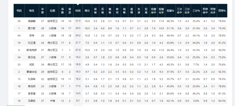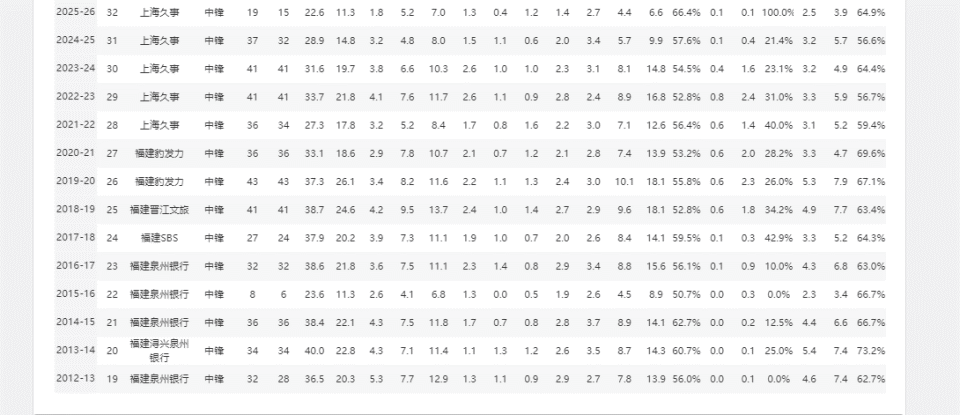 王哲林职业生涯初期出自福建男篮青年队,12-13赛季开始代表福建男篮征战CBA联赛,这也是他CBA生涯的首个赛季。整个赛季下来,当时18岁的王哲林共出战32场常规赛,其中28次首发,场均可出场36.5分钟,出手13.9次,这两项数据,分别位居全队第二高和全队本土第一高,妥妥的球队老大地位。