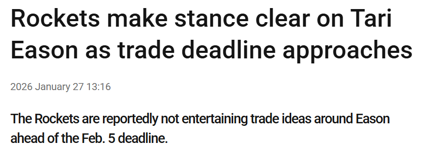 北京时间1月27日,据名记Stein报道,交易截止日来临前,火箭队不考虑任何涉及伊森的交易方案。他们已经回绝所有围绕伊森的交易询价与相关致电。