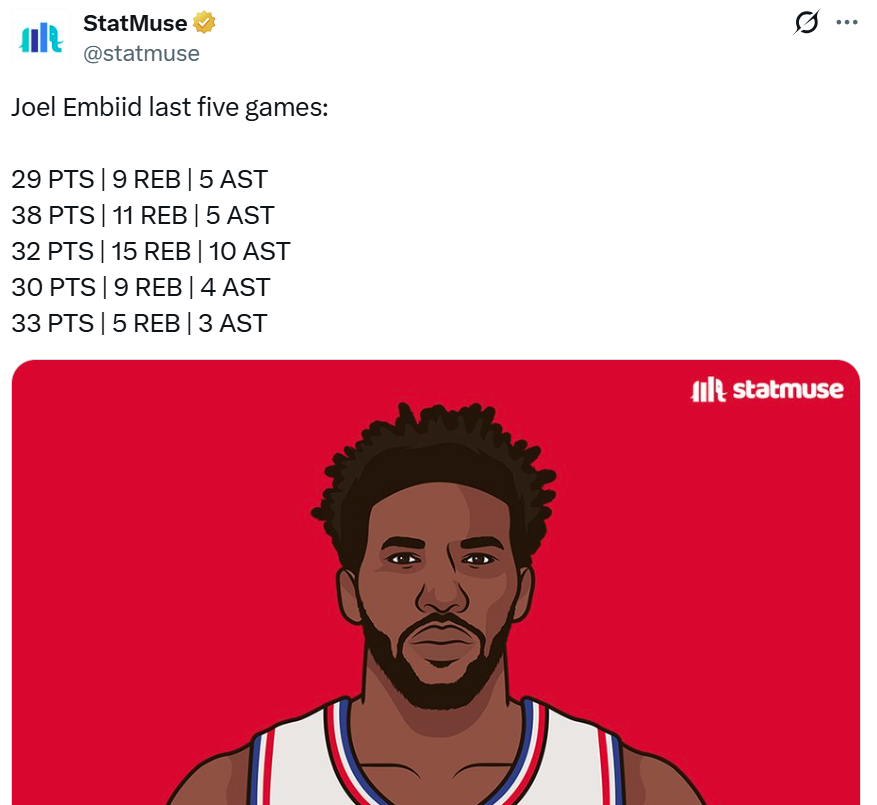 并且恩比德的输出还呈现出明显的上升势头,过去5场比赛恩比德场均数据提升至32.4分9.8板5.4助华丽数据。