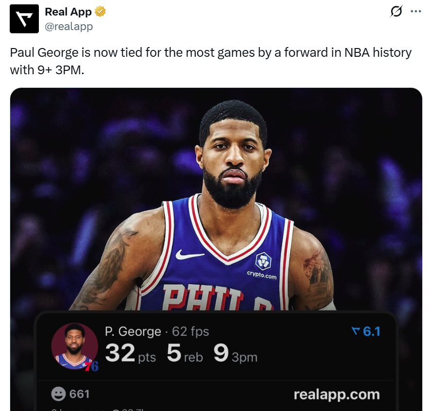 乔治9记三分+大帝梦回巅峰!探花与魔仙齐暴走 76人已超上季总胜场