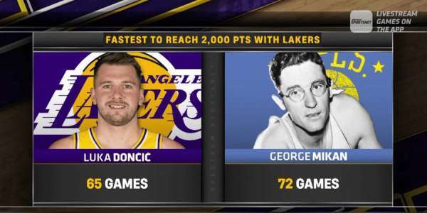 这场胜利背后,是东契奇对湖人队史纪录的“疯狂收割”。最令人震撼的是,他仅用65场比赛就达成湖人生涯2000分里程碑,成为队史最快做到这一成就的球员。这一纪录此前由乔治-麦肯保持了78年,这位1948年的湖人名宿当年用了72场才达成目标,而科比、魔术师、贾巴尔、奥尼尔、詹姆斯等湖人传奇巨星,均未能触及这一成就,东契奇的突破堪称“跨时代”壮举。