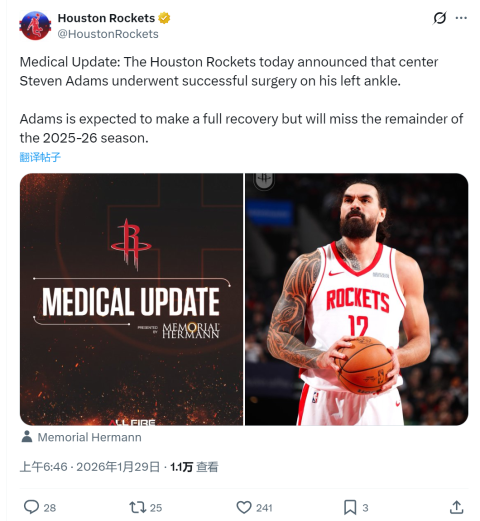 北京时间1月29日上午6点46分,休斯顿火箭官方宣布:球队中锋史蒂文-亚当斯今天成功接受左脚踝手术,将缺席本赛季剩余的所有比赛,2025-26赛季正式报销。亚当斯在10天之前打鹈鹕时脚踝三级扭伤,当时并没有说需要手术治疗。