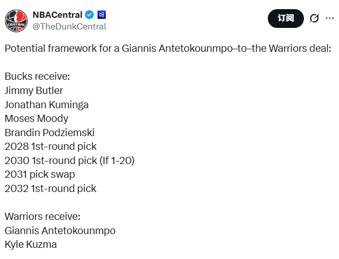 雄鹿队记Nehm列出了双方8换2交易的潜在框架。勇士送出巴特勒、库明加、穆迪、波杰姆斯基、2028年首轮选秀权、2030年首轮选秀权(如果顺位在1-20)、2032年首轮选秀权、2031年选秀权互换资格,从雄鹿换来字母哥和库兹马。