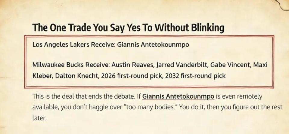美媒《Fadeaway World》撰文建议,湖人应该将里夫斯、克莱伯、文森特、范德比尔特、克内克特以及2026年、2032年的首轮签送到密尔沃基,换回字母哥。