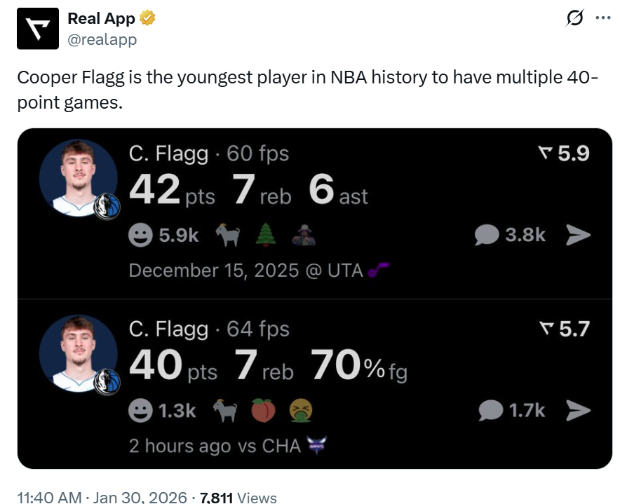 第二项:本赛季第二次轰下40+,成为NBA历史上多次砍40+得分最年轻的球员。