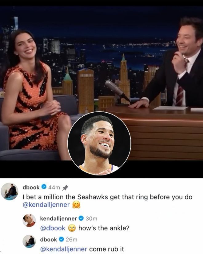 当时,詹娜先是透露自己看好爱国者夺得今年的超级碗(爱国者vs海鹰),布克给她评论说:“我赌了一百万,海鹰会在你之前拿到戒指。”有意思的是,“戒指”指的是“海鹰夺冠和詹娜结婚”。